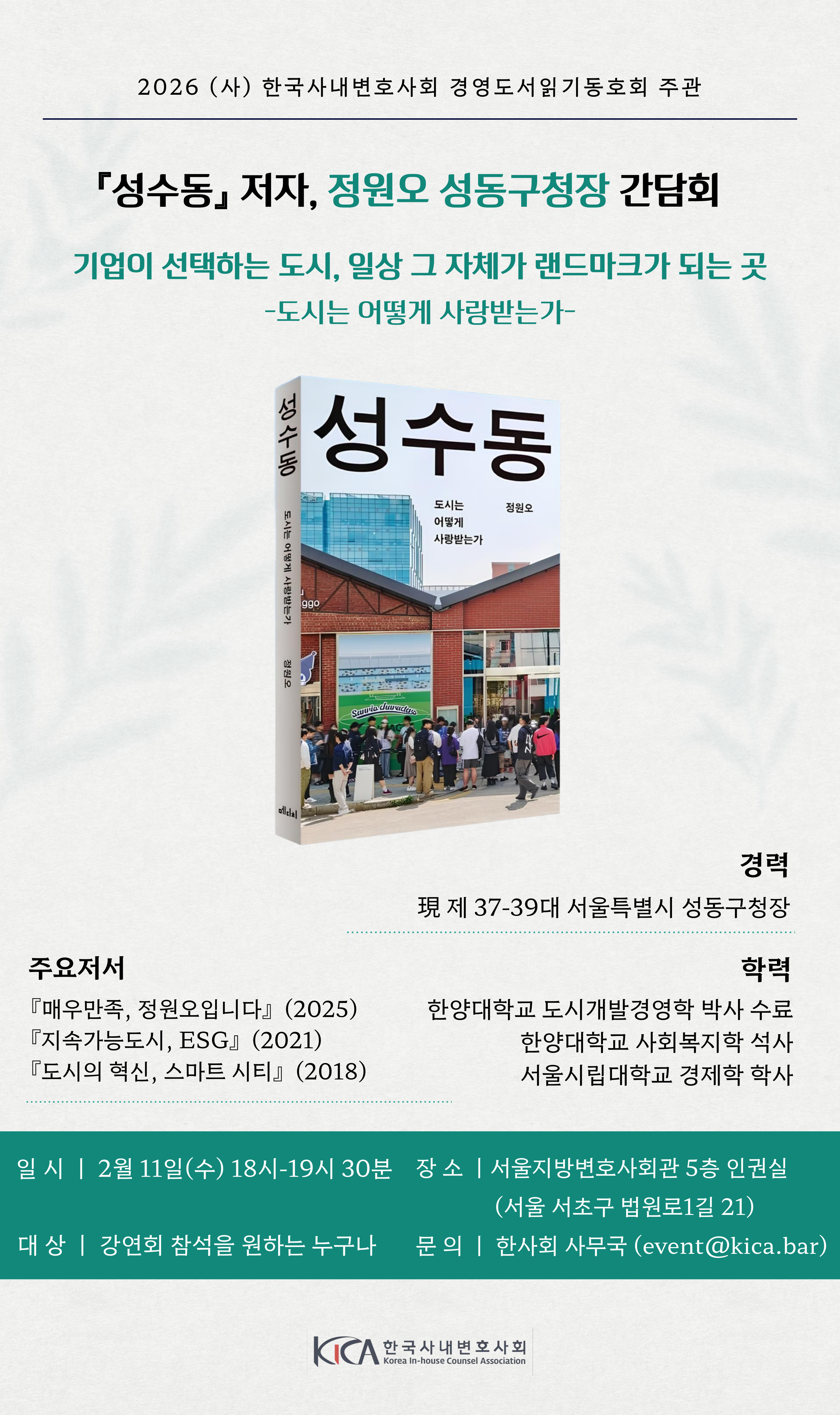 2026년 2월 11일(수) 오후 6시 변호사회관에서 <성수동>의 저자, 정원오 성동구청장 간담회가 진행되었습니다.
